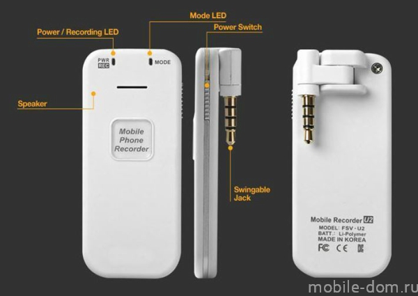 Устройство подсоединяется к телефону через разъем 3,5 мм и позволяет записывать разговоры общей длительностью до 144 часов (насколько позволяет встроенная память). Эту забавную вещицу продают в интернет-магазине Amazon по цене 100 долларов.