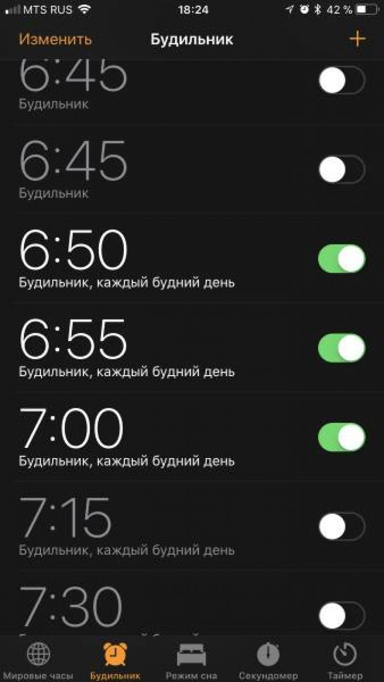 Время подъема можно выставить как для однократного случая, так и поставить его на ежедневный повтор. Более того, если график пользователя не постоянен на протяжении недели, приложение дает возможность выбрать, в какие дни конкретный будильник будет срабатывать. Имеется даже специальная опция «По будням».