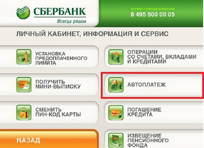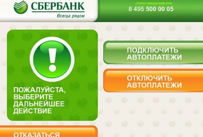 В этом случае процесс также прост. Однако стоит потратить силы, чтобы найти рабочий банкомат. Стоит отметить, что в нем обязательно должна присутствовать возможность выполнить отключение автоматического платежа.