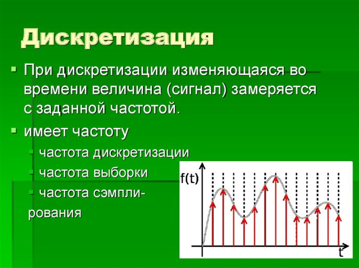 Исходя из этого можно резюмировать, что дискретизация в информатике – это преобразование непрерывного сигнала в дискретный.